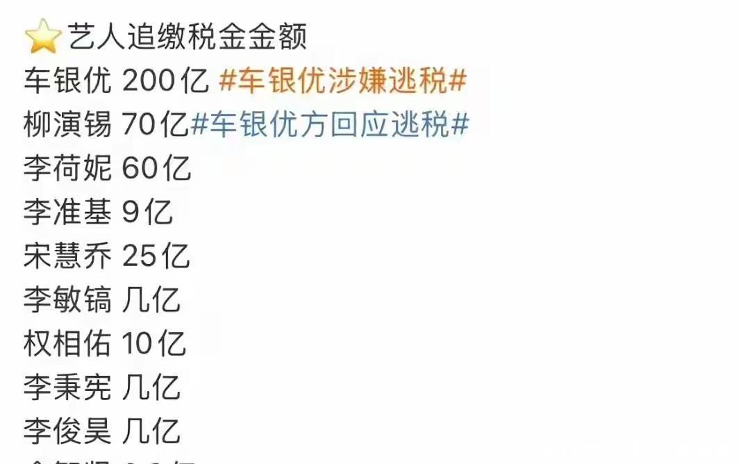 此外还有柳演锡逃税70亿韩元、李荷妮逃税60亿韩元、权相佑逃税10亿韩元、李准基逃税9亿韩元、高小英逃税3亿韩元。