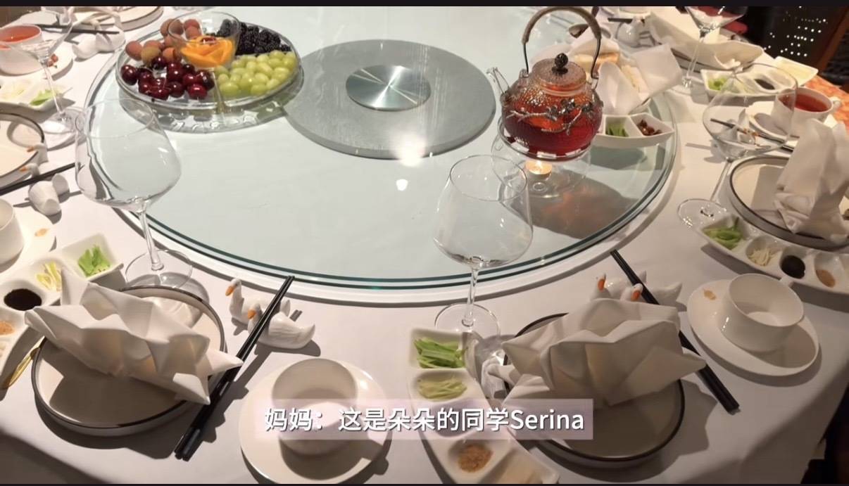 一家人相约在一家高档餐厅,他们吃的是标准西餐,大圆桌铺着白色桌布、一看就是高规格的宴席,徐朵还带了自己的同学一起赴宴。